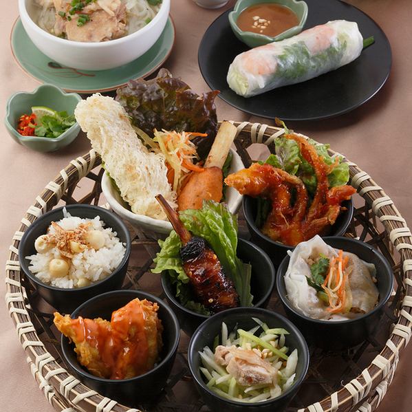 生春巻きと、日替わりの冷菜、温菜、ごはんなど、少しずつたくさんの種類のお料理をお召しあがりいただけます。本日のおかずの内容はスタッフにおたずねください。写真は一例です。ハーフサイズの麺がつきます。